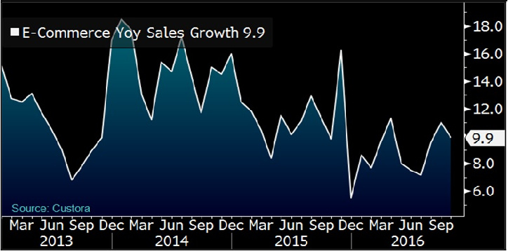 电子商务可能是 UPS、FedEx 和DHL等全球快递公司业务量增长的最大推动力,因为这些公司在扩大货运网络和产能,以满足消费者的需求。至于快递公司不适合处理的大宗重量货物电子商务业务,那些卡车载量不足、并未负责最后一英里终端配送的货运公司将因此受益。市场研究公司Forrester Research 预计,美国电子商务增速约为本国经济增速的 4 倍,到2020年,其复合年增长率将达到 9.3%。