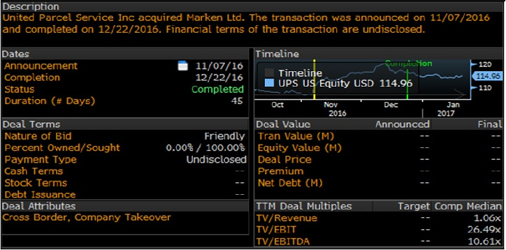 2016年12月,UPS 公司收购了提供直送病患服务和生物样品配送的公司 Marken。这符合 UPS 公司向医疗保健领域投资 700 亿美元的增长战略。虽然交易细节鲜有公布,但 Bloomberg Intelligence 行业研究估算,这次收购应该会让 UPS 公司的每股收益增加0.01美元。作为 UPS 全资持有的附属公司,Marken 公司应该会为前者扩大的临床试验物流要素能力予以补充。复杂的医疗健康供应链需求可能给UPS带来新的机遇。