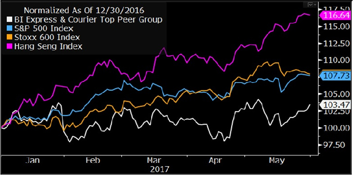 截至5月31日,2017年 BI 行业研究精选的一组顶级全球快递服务企业股价累涨约3.5%,较同期标普500涨幅低约430个基点。这批标杆企业表现同样落后于香港恒生指数和欧洲斯托克600指数,分别低1320个基点和440个基点。虽然这批企业2016年以14%的股价涨幅跑赢大盘,但2017年受到全球贸易不确定性的拖累。FedEx致力于把握全球电子商务版图扩大的潮流,已经成为2017年行业增长的领头羊。