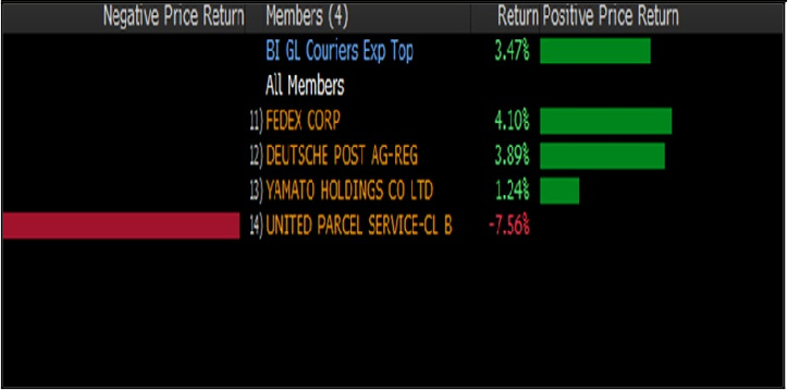 受到影响的企业:Yamato Holdings、UPS、DHL 和 FedEx 都位列 BI 行业研究全球快递服务顶级标杆企业。评估这些快递服务板块个股的有效方法就是,看一看他们的股价相对股市基准股指表现如何。