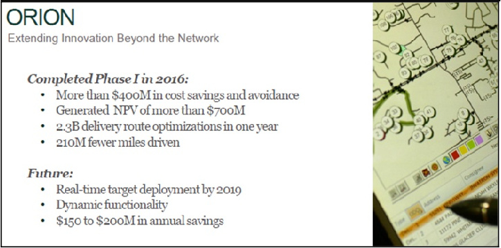 快递公司利用高科技帮助提高利润和服务水平,提供更有效率、更灵活的操作计划,以便更好地为客户服务。例如,UPS 公司为优化送货司机驾驶路线而设计的程序 ORION。它已经将司机每英里平均停靠点增加了 9%,通过让送货点更密集帮助降低了平均每件快递的成本。UPS 公司要在升级版的 ORION 中设置更机动的实时系统,预计将在年均节省 4 亿美元的基础上将成本进一步减少 1.5 亿到 2 亿美元。