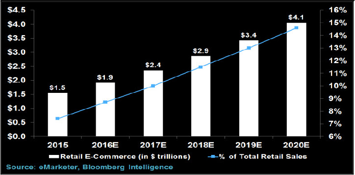 到2020年,亚太区的线上消费支出预计约占全球支出总额的三分之二。中国经济转变为消费驱动型将推动亚太区线上消费增长。除了B2C的流量,电子商务的长期增长将为仓储、执行订单、逆向物流和跨境交易提供商机。市场研究机构eMarketer预计,2020年,全球电子商务市场规模可能由2016年的1.9万亿美元涨至4万亿美元以上,约占零售业消费支出的15%。