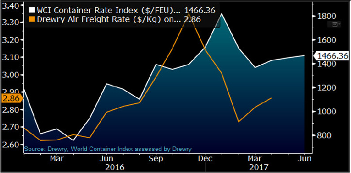 海运和空运费在攀升,但这是在2016年下降后反弹。这应该会让货运代理在 2017年下半年仍然面临盈利的压力。虽然利润下滑,但需求和业务量在增长。DSV 和 Kuehne + Nagel 这类公司在通过强劲的业务增长缓和利润方面的制约。2017年第二季度,Kuehne + Nagel还将承受海运业务利润下降的压力,但考虑到二季度很多合约会续约,下半年应该形势应该会好转。