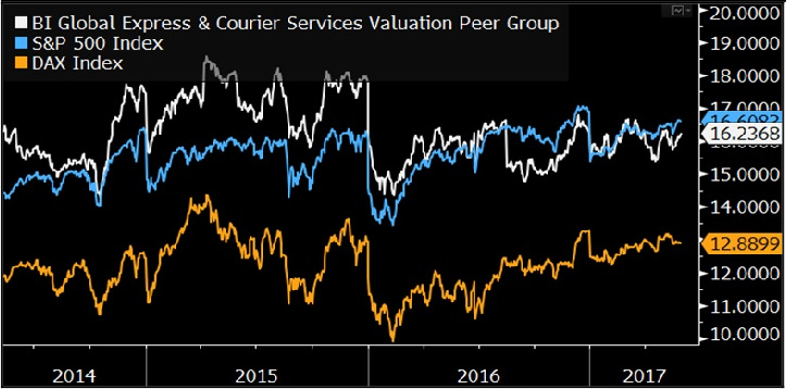 DHL 母公司 Deutsche Post 交易价较德国 DAX 指数溢价5%。2017年以来,在电子商务和 FedEx 公司和 UPS 公司的运营决策推动下,快递业标杆企业未来市盈率倍数较上年同期增长21%,增速超过大盘,标准普尔增长6.9%,DAX 下降2%。