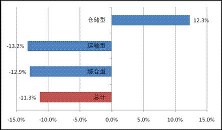 从不同类型看,2009年运输型物流企业主营业务收入降幅最大,同比下降13.2%;综合型物流企业主营业务收入由去年的增长36.2%转为下降12.9%;仓储型物流企业主营业务收入同比增长12.3%,但增幅同比回落19.9个百分点。