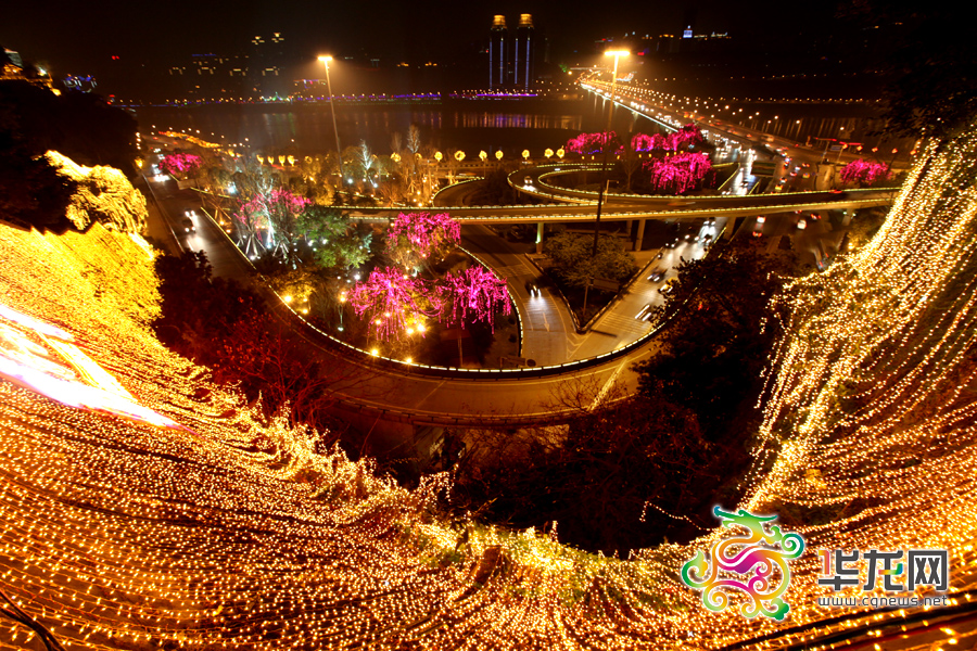 渝中区石板坡立交桥的灯饰直流而下,形成瀑布。 记者 李文科 摄