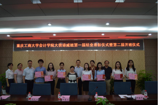 2017年6月30日15:00,会计学院大信谛威班第一届结业表彰暨第二届开班仪式议程在厚德楼2017会议室成功举办。出席本次活动的嘉宾有:大信谛威首席合伙人张辅辙、大信重庆分所所长刘先利、人力资源部副经理余斯娟、培训部副经理刘春梅、人事部周凤。我院到场的领导有:会计学院党委书记罗惠玉、副书记尹建平、副院长程文莉、党政办主任郭敏以及学团办主任刘斌。除此之外,大信谛威班2015-2016年在职校友20人,以及大信谛威班第二届学员50名学员也参加了此次活动。